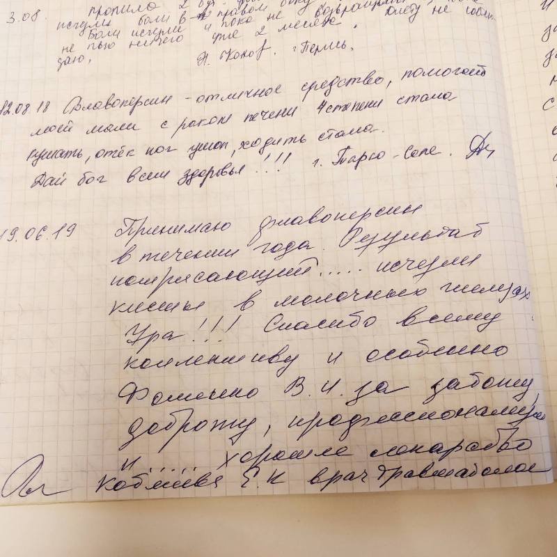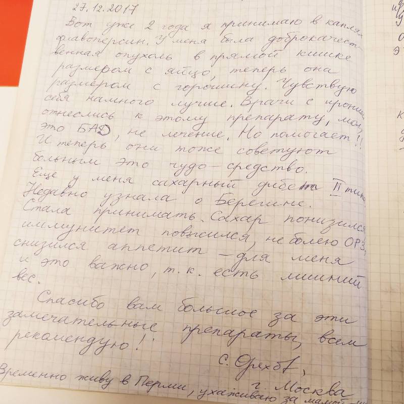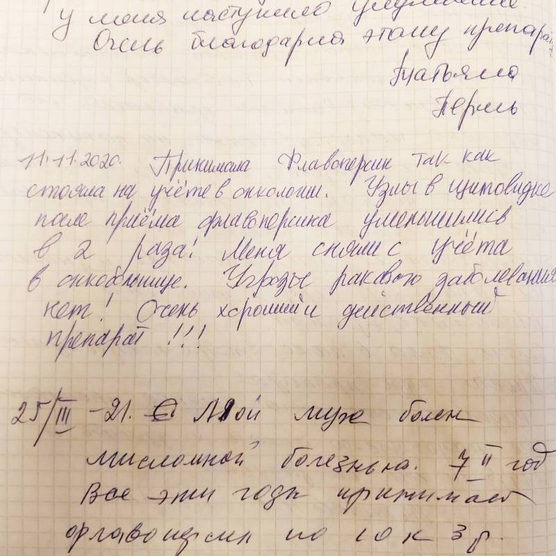 Предлагаем вам почитать отзывы наших клиентов, которые принимали БАД "Флавоперсин". Мы храним их бережно в тетради и решили показать вам как они есть — написанные от руки и с искренней благодарностью. Для тех, кто еще не знаком с "Флавоперсином": Эта биологически активная добавка состоит из экстрактов листьев двух уникальных по своим целебным свойствам растений: персика и облепихи. Объединив эти свойства, "Флавоперсин" оказывает мощнейшее действие для поддержания и восстановления жизненной энергии и здоровья.