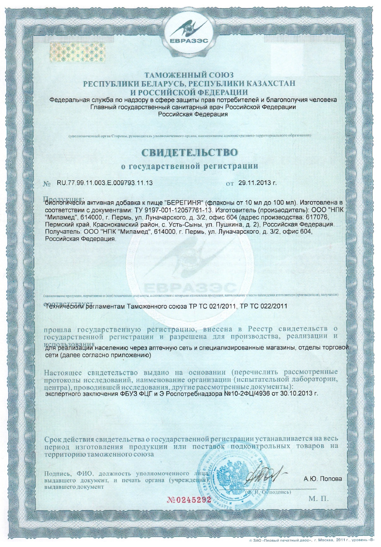 Свидетельство о регистрации