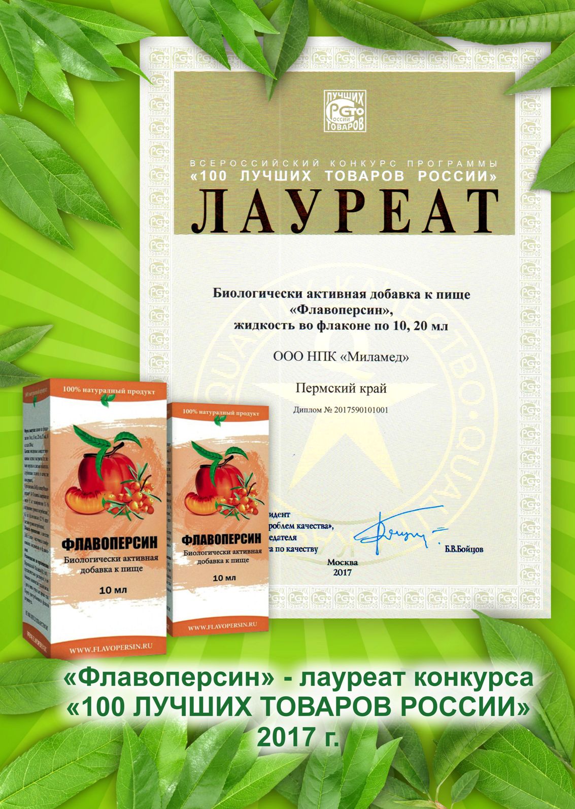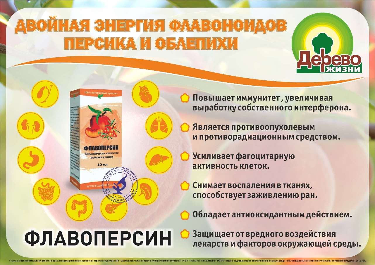 БАД «Флавоперсин» состоит из экстрактов листьев двух уникальных по своим целебным свойствам растений: персика и облепихи. Каждое из них обладает собственным широким спектром биологической активности. Флавоперсин, соединив в себе силы экстрактов двух удивительных растений, представляет собой мощнейшее средство для поддержания и восстановления жизненной энергии и здоровья. Облепиху можно назвать одним из самых полезных и действенных целебных средств, которые нам подарила природа. Известно, что и более древняя китайская, тибетская и древнемонгольская медицины использовали облепиху в своих рецептах. В 2017 году БАД "ФЛАВОПЕРСИН" стал Лауреатом Всероссийского конкурса Программы «100 лучших товаров России»