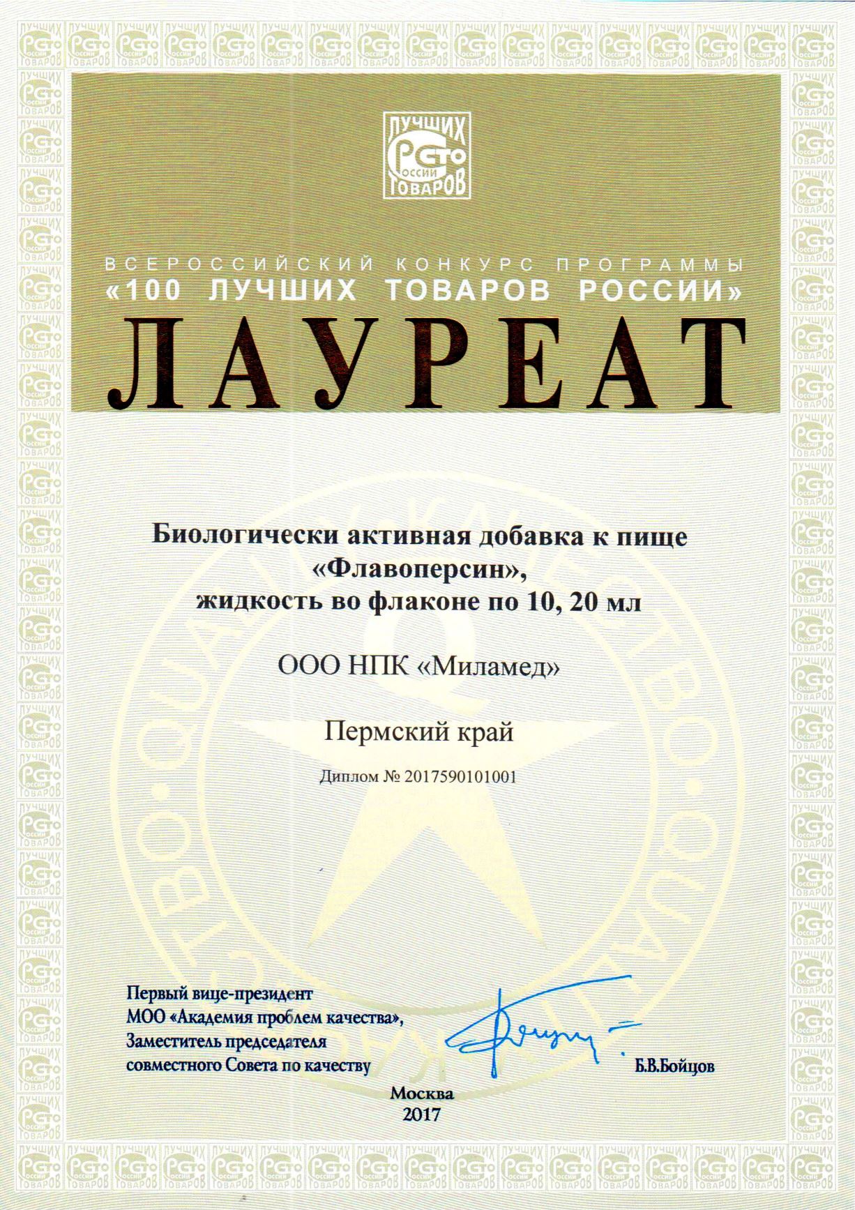 БАД "ФЛАВОПЕРСИН" стал Лауреатом Всероссийского конкурса Программы «100 лучших товаров России»