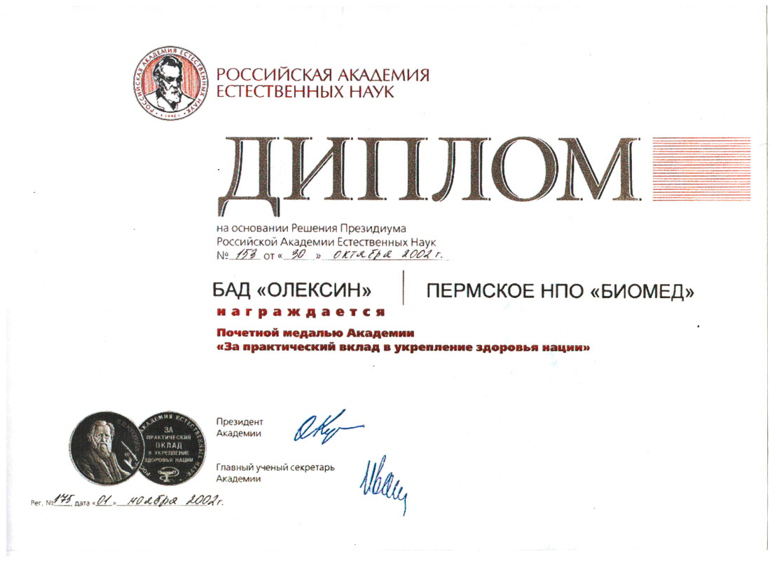 | Диплом Мечникова | Диплом Пауля Эрлиха | | | | В 2010 году «Олексин» стал лауреатом конкурса «100 ЛУЧШИХ ТОВАРОВ РОССИИ» Подробнее | | | |