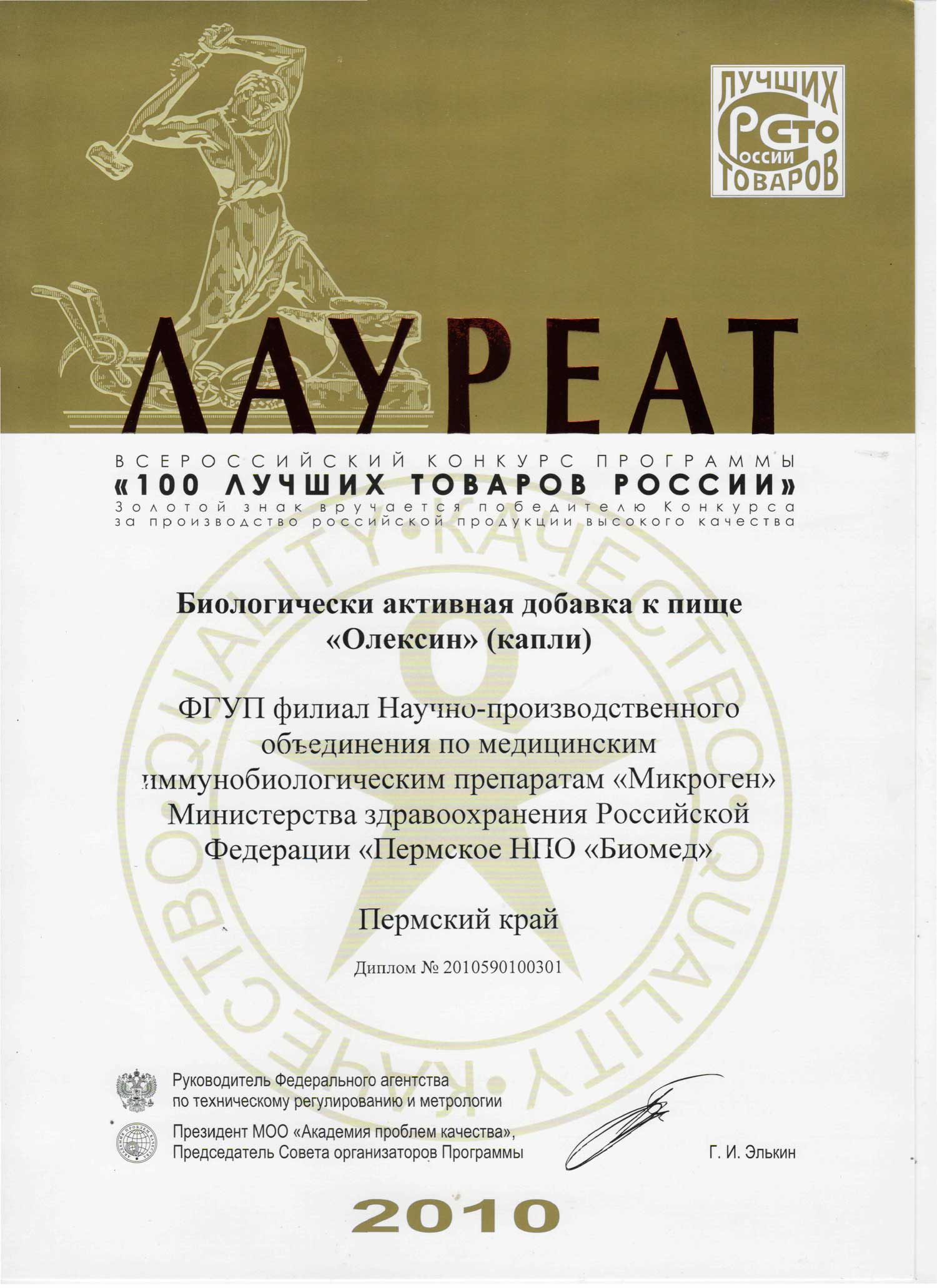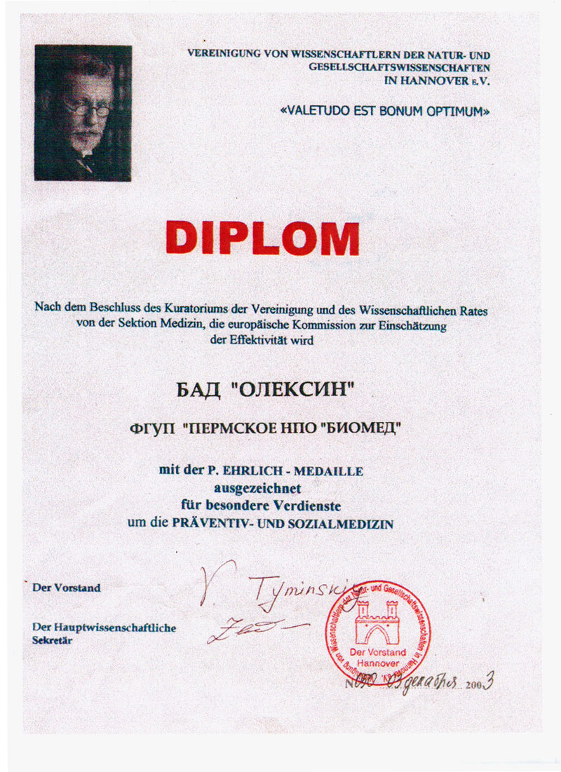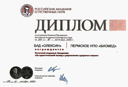 | Диплом Мечникова | Диплом Пауля Эрлиха | | | | В 2010 году «Олексин» стал лауреатом конкурса «100 ЛУЧШИХ ТОВАРОВ РОССИИ» Подробнее | | | |